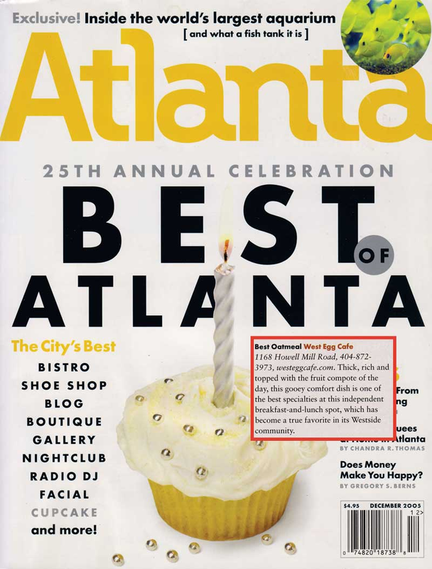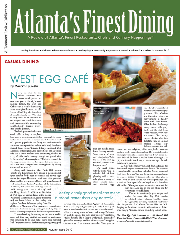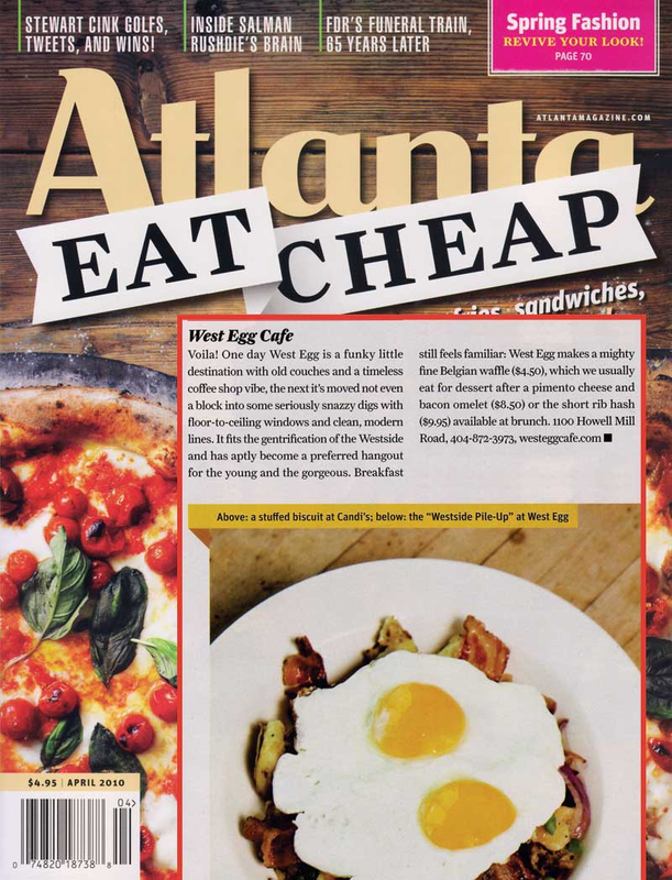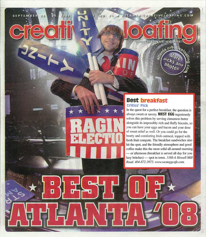 Open since 2004, West Egg serves up Southern comfort in a modern, energetic environment. We are a full service restaurant serving best-in-Atlanta breakfast all day, lunch, and weekend brunch, with a full bar. We also offer a separate coffee shop area with a comfortable lounge, free wi-fi, a walk-up counter with baked goodies, and full coffee menu serving locally-roasted Kaldi’s Coffee (formerly known as Dancing Goats Coffee and previously Batdorf & Bronson, but still the same great coffee!).